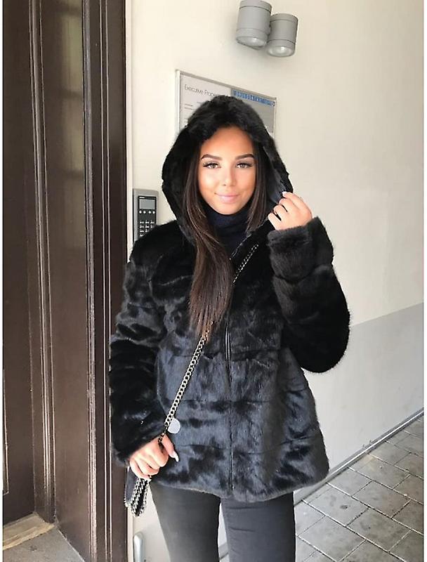 Fuskpälsjacka Furby-ja från Vivanilla är svart. Modellen är rak med luva. Den har dragkedja framtill.Midjemått ca 104cm och längd ca 56cm i stl L. Normal i storleken.100% polyester. Rex Rabit 30 grader maskintvätt.