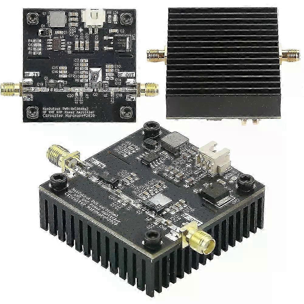 05-800MHz VHF UHF RF Power Amplifier HF VHF UHF Transmitter Power Amplifier Module for Ham Radio 0.5-800MHz 40dB Gain HF VHF UHF RF Power Amplifier HF VHF UHF Transmitter Power Amplifier Module for Ham Radio Features: 1. High Manufacturing Standards: Manufactured according to original production specifications, this HF VHF UHF RF power amplifier meets strict quality standards, ensuring reliable performance and durability. 2. Stable Performance: As a professional HF VHF UHF transmitter power amplifier module, it operates within a frequency range of 0.5-800 MHz, providing stable and consistent performance across its operational bandwidth. 3. Efficient Heat Dissipation: Designed with a large heat dissipation area, this HF VHF UHF amp is capable of maintaining long-term operation without overheating, reducing the risk of damage. 4. Seamless Construction: Featuring a seamless, burr-free design with a smooth surface, this RF power amplifier module is easy to install, enhancing user convenience and reducing installation time. 5. Durability and Reliability: The combination of high manufacturing standards and efficient heat management ensures that this HF VHF UHF amplifier is both and reliable, suitable for demanding applications. Specification: Origin: Mainland China Product size: 70.00x50.00x21.00mm/2.76x1.97x0.83inch Color: black Input voltage: 15-30V DC Output power: about 15W Action range: 0.5-800MHz Output power: about 35-37dBm Gain: maximum about 40dB Material: mixed material Note: Due to different monitor settings and lighting conditions, the actual color of the item may vary slightly from the pictures. Thanks for your understanding! Please allow a 1-2 cm difference in measurements due to manual measuring. 1 xRF Power Amplifier