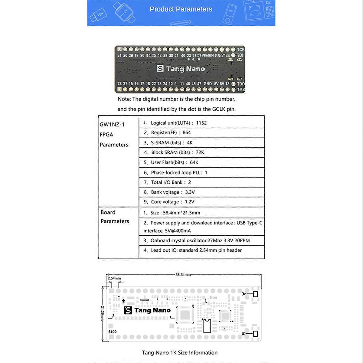 Tang Nano is a simple development board based on GOWINSEMI's Bee series GW1N-1 FPGA design. The design of the development board is small and exquisite, leading out all the resources of the chip, onboard Type-C, USB-JTAG, PSRAM, RGB interface (can be connected to LCD screen, VGA and other peripherals), etc., and leading out all IO resources to facilitate development It is very suitable for the design and experiment of small digital logic. The GW1N-1 FPGA chip on the Tang Nano development board is very powerful, has rich logic resources, supports multiple I/O level standards, and is embedded with block , PLL, Flash and other resources. A non-volatile FPGA product; In addition, the onboard 64Mbits PSRAM provides abundant storage resources for the FPGA. parameter: Core: GW1N-1 FPGA Logic Units (LUT4): 1152 Registers (FF): 864 Block (bits): 72K Number of B- blocks: 4 User flash memory (bits): 96K Phase-locked loop PLL: 1 Total I/O : 4 Maximum number of user I/O: 41 Core voltage: 1.2V size: 58.34 x 21.29mm Material: PCB colour: black Package Contents: 2 x FPGA Development Board Only the above package content, other products are not included. Note: Light reflection and different displays may cause the color of the item in the picture a little different from the real thing. The measurement allowed error is +/- 1-3cm.