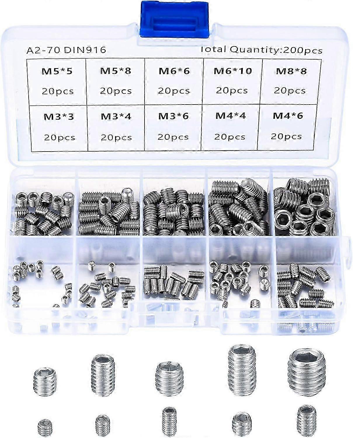2025 Latest Model 200 Pieces Stainless Steel Grub Screws, M3 M4 M5 M6 M8 Machine Screws, Assortment Kit of F