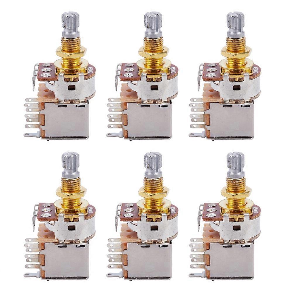 500K split shaft push pull-Double Pole Double Throw 18 Tooth Coarse Spline Shaft-Takes 6mm Metric Knob Allows wiring modifications such as coil shifting and tapping and phase shifting Color:silver + gold material:metal Size:18mm Package Contents: 6pcs x Potentiometers Only the above package content, other products are not included. Note: Light reflection and different displays may cause the color of the item in the picture a little different from the real thing. The measurement allowed error is +/- 1-3cm.