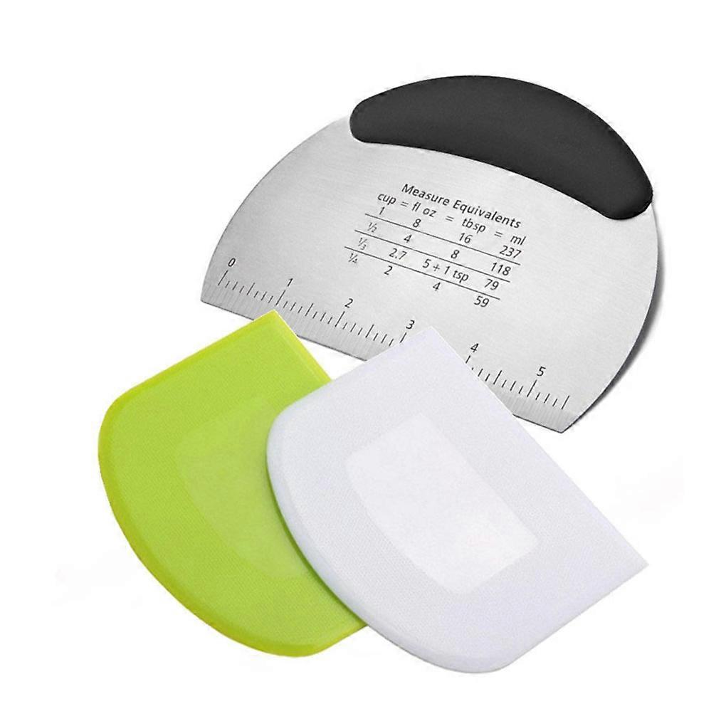Description: Wide Application: This pastry scraper is for cutting and portioning for dough, as well as for scraping up sticky ingredients from your work surface Made of Stainless Steel and PE: Our for dough scraper is crafted with premium materials, ensuring its durability and longevity Safety and Reliable: The rounded for edges of our for dough scraper make it safe to handle, protecting your hands from cuts and injuries Sturdy and Durable: This for dough scraper is designed to withstand heavy use, allowing you to confidently tackle any baking or cooking task Easy to Use and Clean: The ergonomic handle of our pastry scraper provides a comfortable grip, while its seamless makes it easy to clean after use Multifunctional: Besides its primary use as a for dough scraper, this versatile tool can also be used for smoothing icing, chopping vegetables, and more Specification: Color: black. Material: Stainless Steel,PE. Size: Approx 16 cm*11.8 cm *1.5 cm/6.30*4.65*0.59inch. Note: There might be a bit color distortions due to different computer resolutions. There might be a slight errors due to different hand measurement. Package Includes: 1 Set Of Baking Tools [3 Pieces]