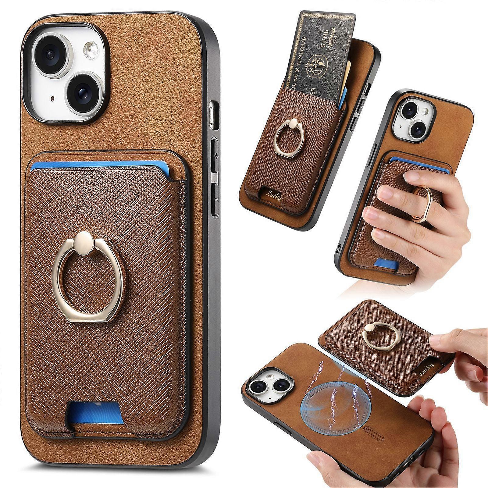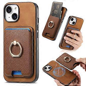 Case For Iphone 14 Pro Brown Magnetic Card Slot Ring Holder Plain Leather Anti-fall