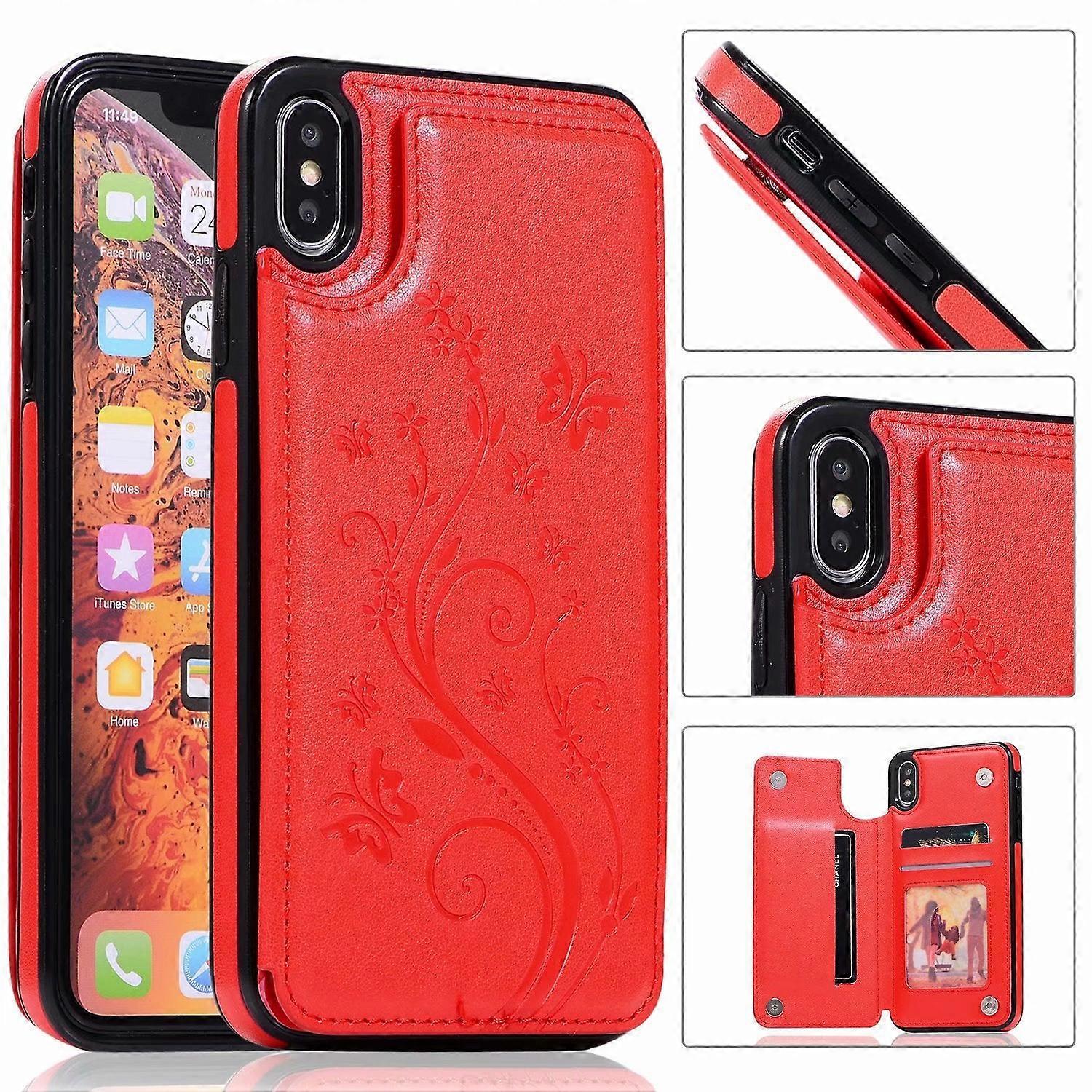 Case For Iphone 14 Pro Red Embossed Butterfly Card Slot Love Flower Double Buckle Holder
