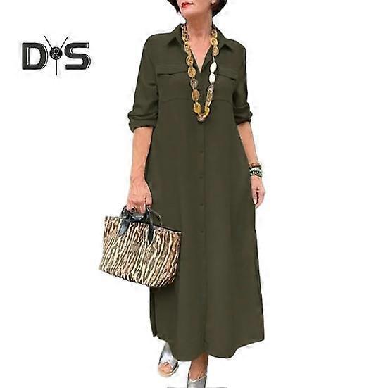 Women Dress Turn down Collar Loose Solid Color Long Sleeve Single breasted A line Chest Pocket Soft Breathable Ankle Length Spring Fall Maxi Dress
