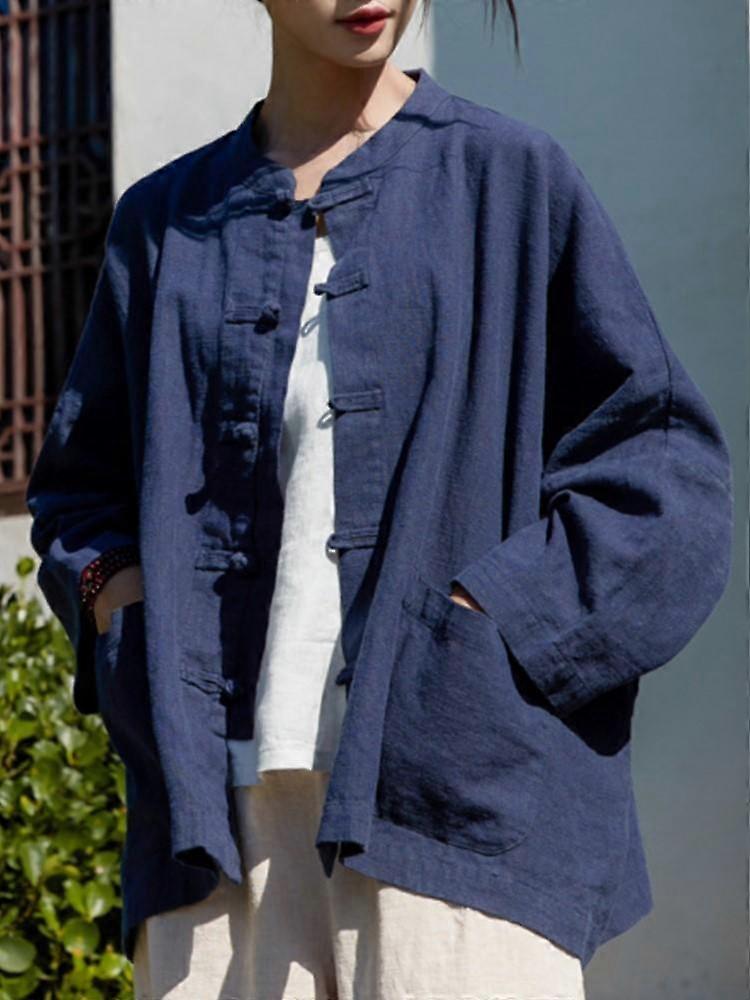 Johnature Women Chinese Style Bat Sleeve Jackets Button Solid Color Vintage Linen Coats Pockets Stand Autumn Women Loose Jackets