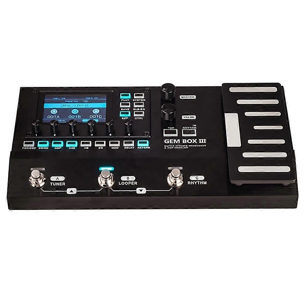 JOYO GEM-BOX3 Multifunctional Integrated Electric Acoustic Guitar Effector with Pedal and Drum Machine 1. 55 high-quality preamp modulations 2. 9 effect modules, a total of 151 effect types 3. 26 built-in cabinet modulation, support third-party infrared 4. 300 preset tones 5. Adjustable signal chain lets you arrange internal effects the way you like Various interfaces suitable for different venues 6. Humanized knob 7. Programmable outputs for easy integration into any real-time setup 8. Support USB recording, PC editing and firmware update. (Windows PC requires ASIO4ALL driver)) 9. Integrated 52 Second Luber 10. Support headphone output, quiet practice 11. Support audio playback auxiliary input 12. Drum machine with 40 drum patterns and 10 metronome rhythms. 13. Infrared file format: WAV 14. Sampling accuracy: 24bit (support 162432 third-party IR files) 15. Sampling rate: 44.1KHz (support full sampling rate third-party infrared load) 16. Sampling length: 1024 points