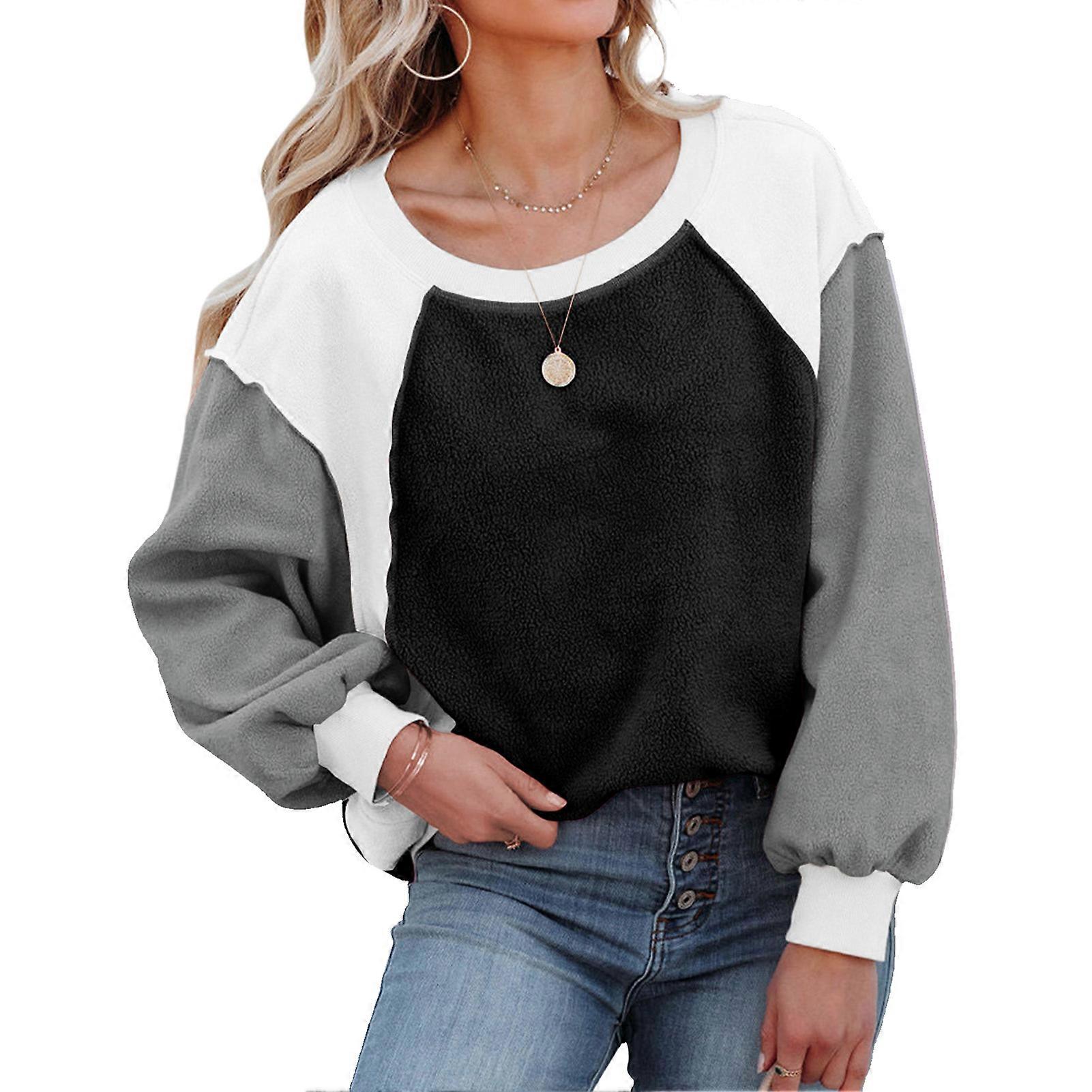 Women Crewneck Fuzzy Fleece Sweatshirt Casual Fashionable Long Puff Sleeve Color Block Pullover Tops