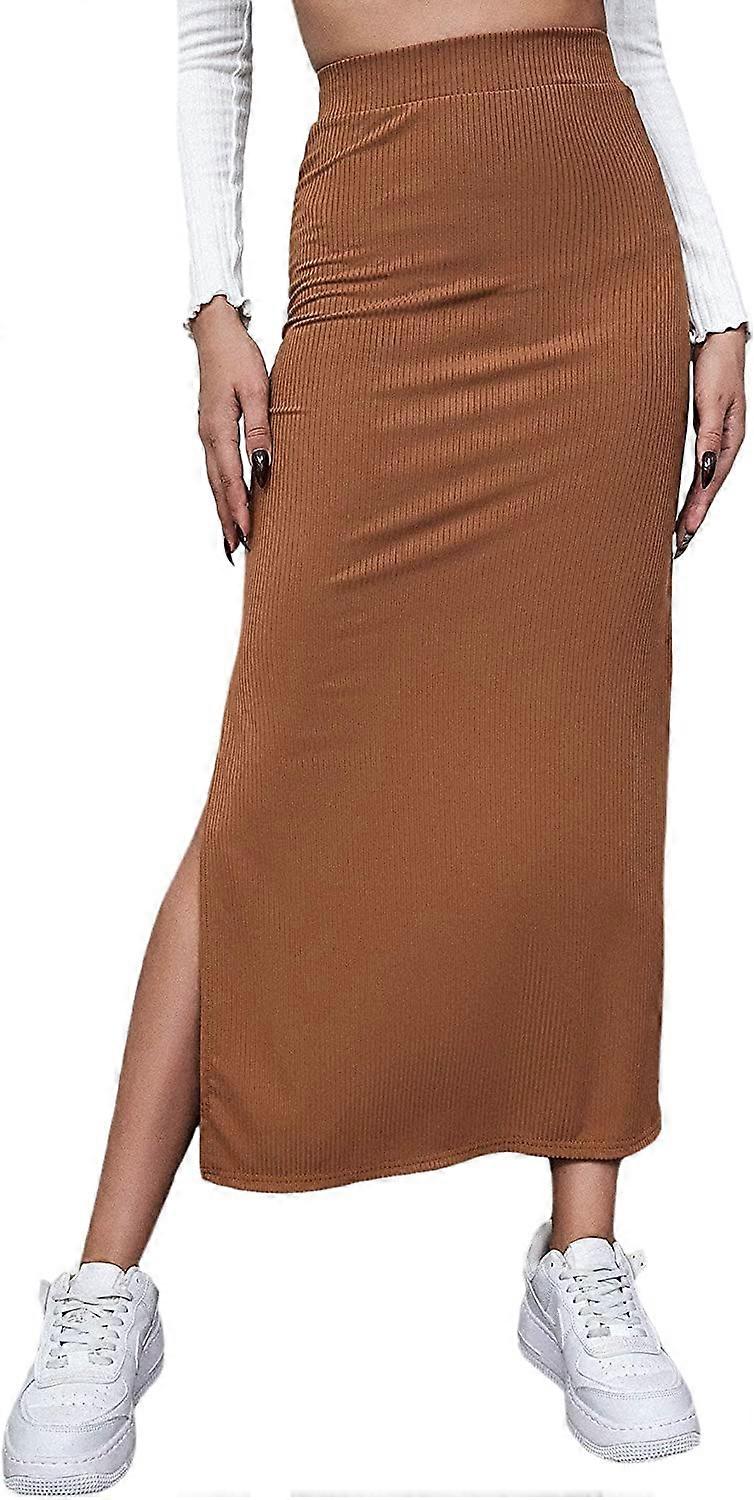 Women's Elastic Waisted Split Thigh Rib Knit Long Maxi Bodycon Pencil Skirt S-2XL
