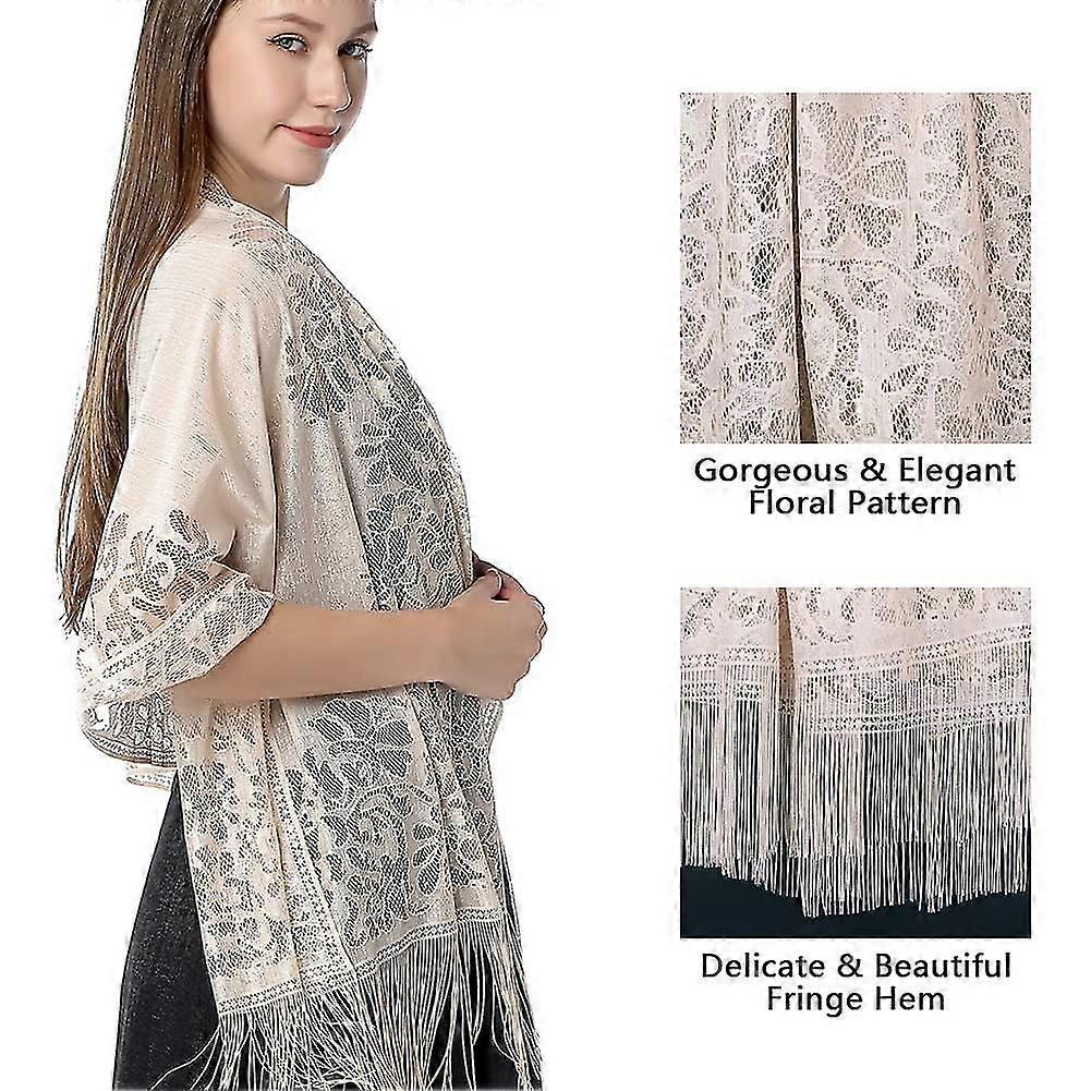 Ladiery Women's Floral Lace Scarf Shawl With Tassels, Soft Mesh Fringe Wraps For Wedding Evening Party Dresses