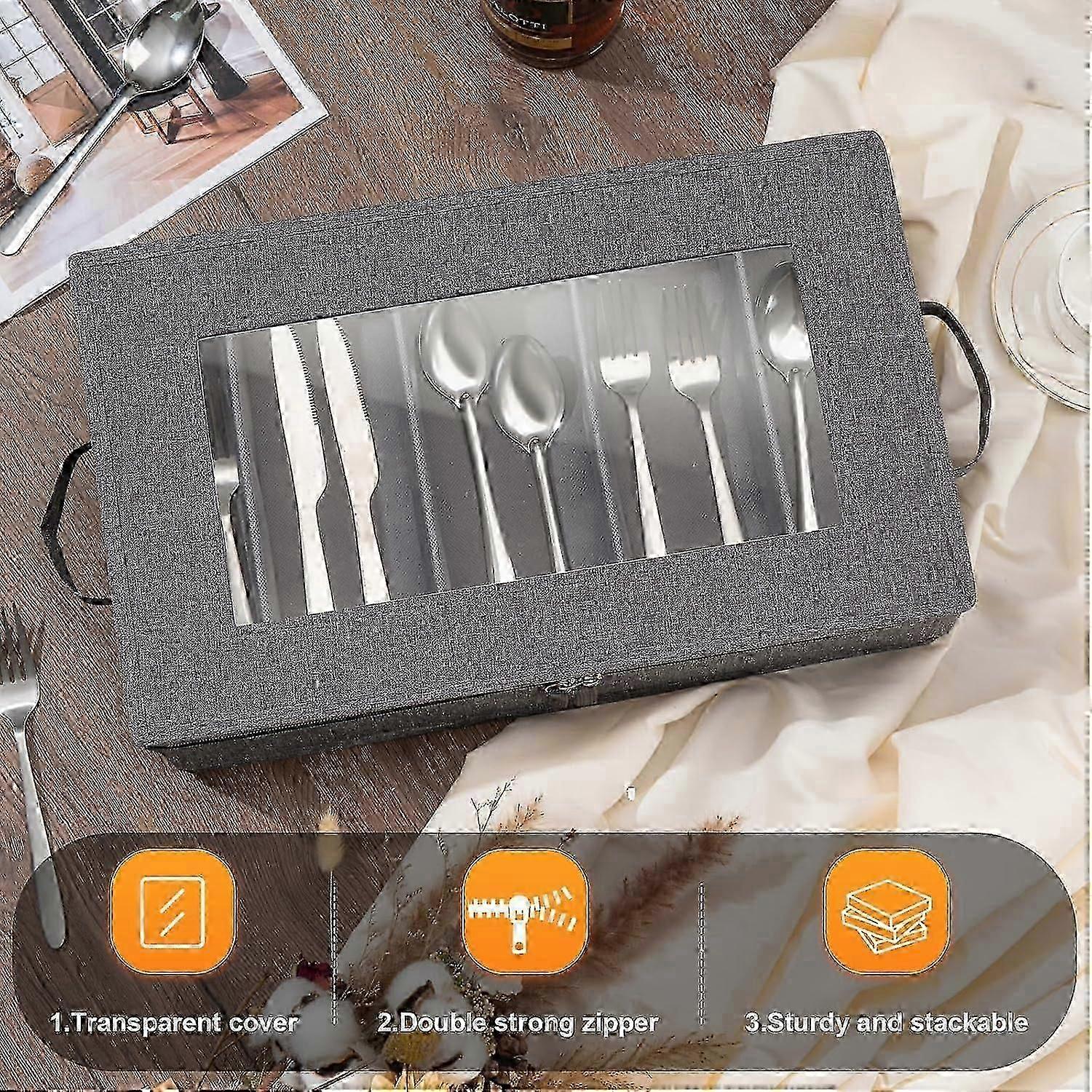 Large Capacity Silverware Storage Case, Gray Utensil Organizer with Zipper Lid