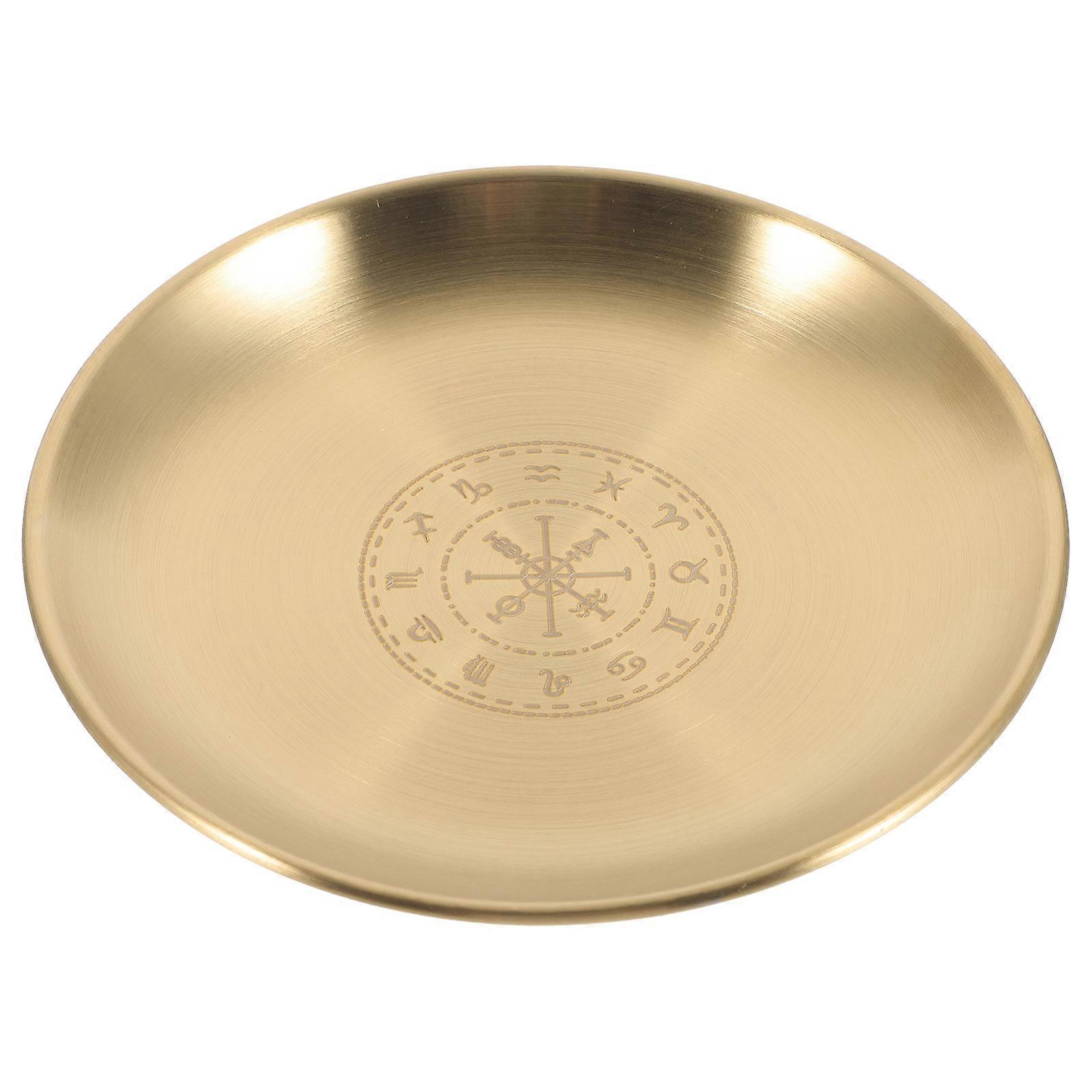 Jewelry plate was adopted of iron material for your lasting use. Made with a unique pattern that the jewelry plate is sure to impress. Great for storing rings, necklace, bracelets, anklets, and more, also for altar use, wide range of application, meeting your needs well. Features - ColorGolden -Material:Iron - Size: 14.30X14.30X1.00cm/5.62X5.62X0.39in - Witch altar tray is decorative and functional, sacred and mysterious, great as ritual supplies. - Elegant and luxurious storage tray, widely used, suitable for home, office and altar table. - Tray can be as a place tray of objects for family sacrifices or religious ceremonies. - Ring dish plate is compact in size, you can easily take it to various kinds of places according to your needs. - Unique and altar theme design, enhance the effectiveness of mysterious props. Package list: 3 x Jewelry Plate