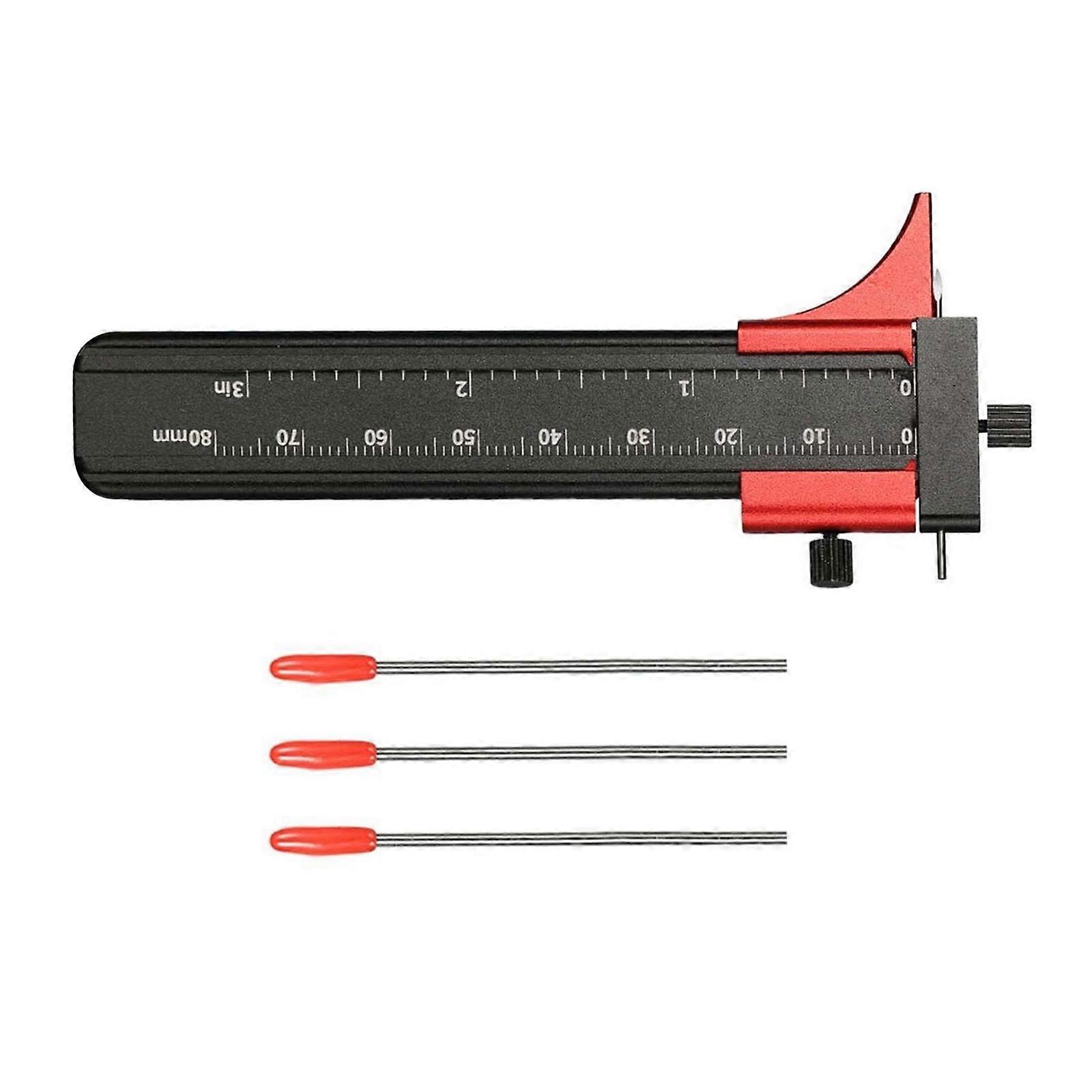 Features: The isometric line ruler has been lengthened, widened and thickened as a whole, which is comfortable and portable. The precise size of the overall engraving line is up to 80mm, and the double fixed slide rails are precisely controlled. The top nut controls the position of the marking needle, and the right end nut adjusts the position of the vernier scale. The tungsten steel triangular head marking ruler is compatible with sharp and wear-resistant, the marking is smooth, and the operation efficiency is improved. Specifications: Brand: for DSPIAE Name: Parallel Scribing Tool Material: Aluminum alloy, Tungsten steel, Stainless steel Size: 110*40*6mm Package include: 1pcs* Parallel Scribing Craft Ruler 3pcs Pin