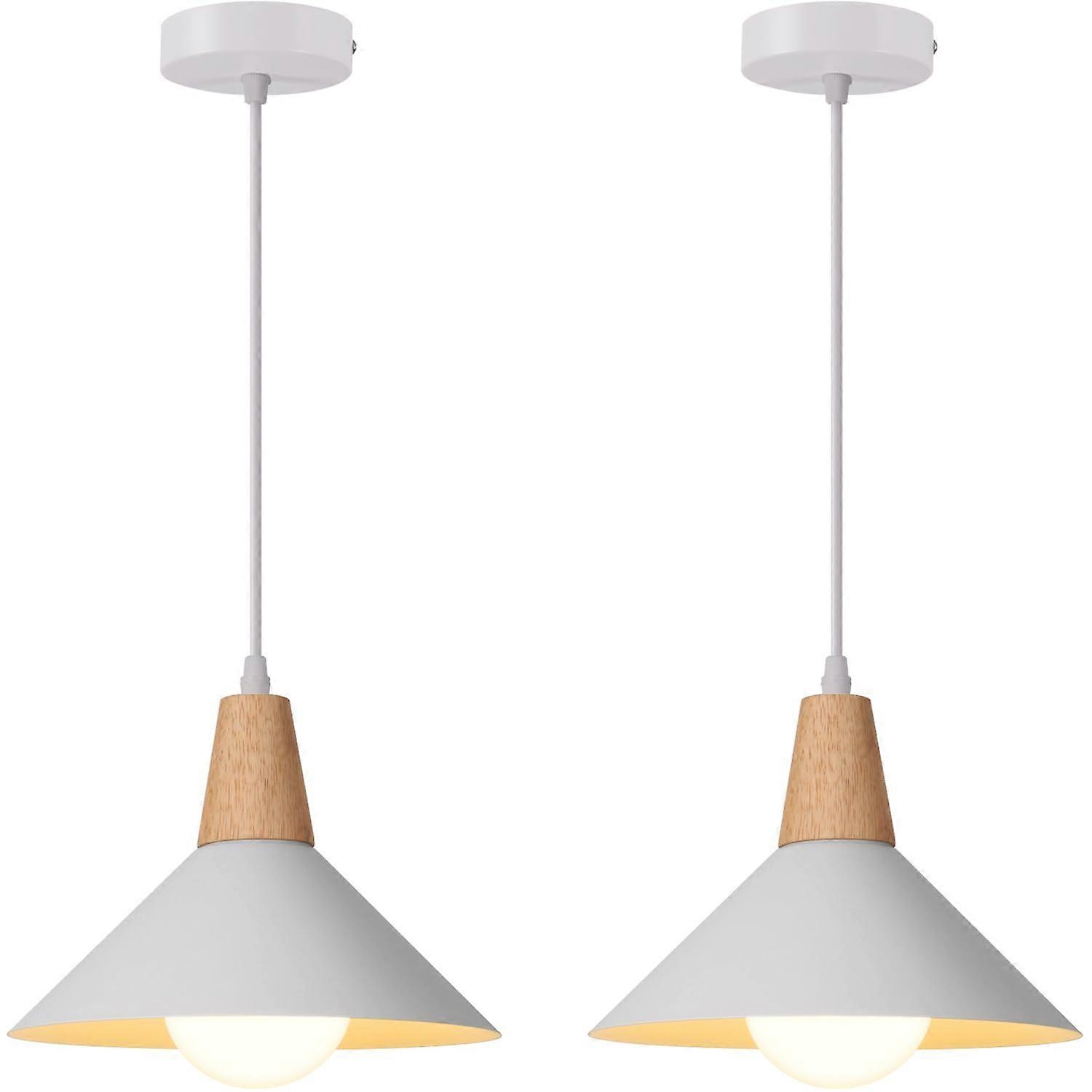 Set of 2 Retro LED Pendant Lights - Modern Scandinavian Metal Wood Ceiling Lights for Bedroom Dining Room Kitchen, E27, 25 cm, White Brown