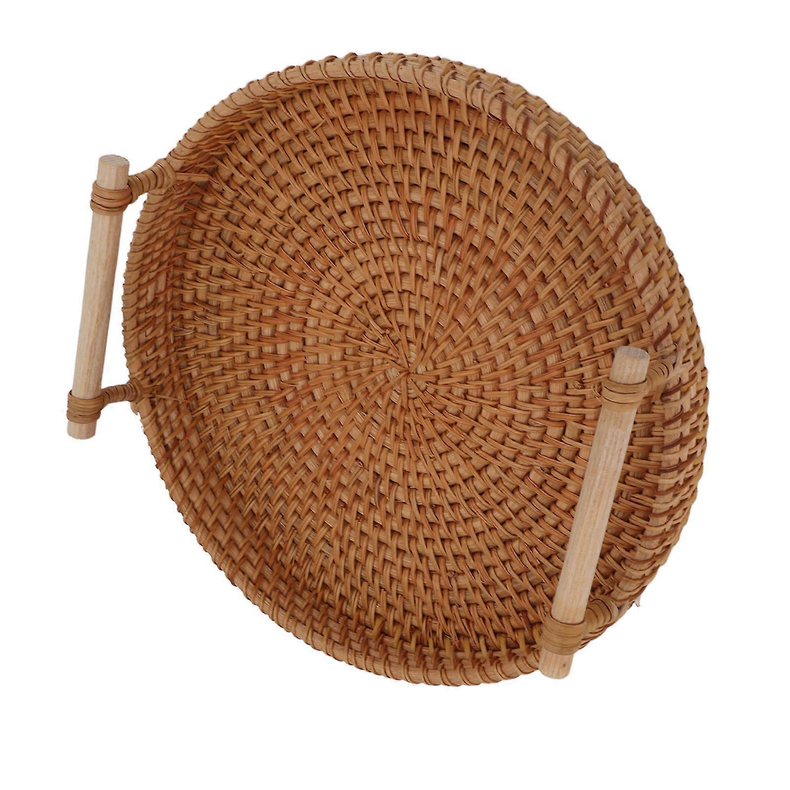 Rattan Fruit Tray with Solid Wood Handles Exquisite Hand Woven Round Serving Tray for Storage Display Bread Fruit M