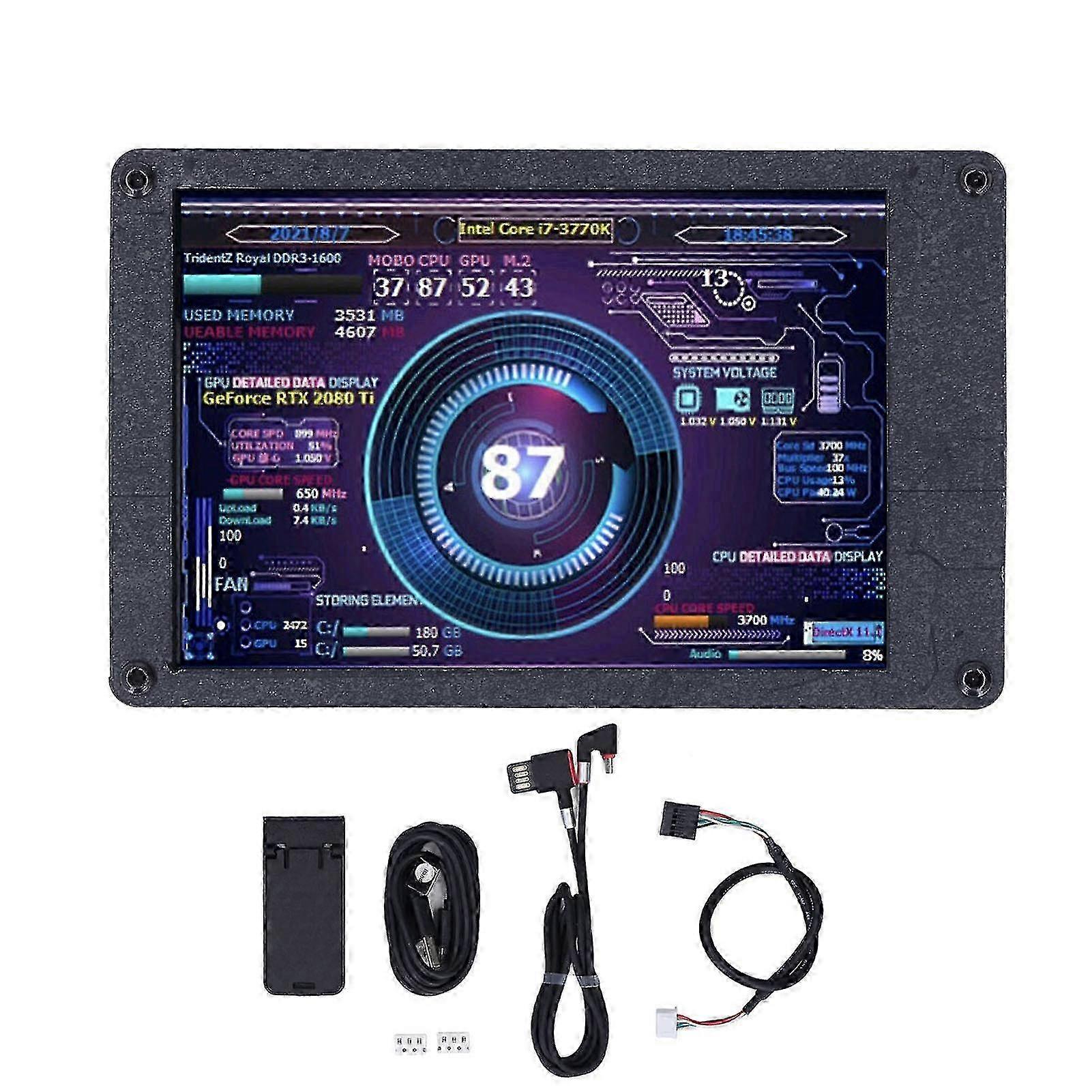 1,5 INCH SCREEN: This monitor has a clear display, supports horizontal and vertical screen switching, and adjustable screen brightness. 2,MULTIPLE FUNCTION: This monitor not only displays CPU, GPU, RAM usage and temperature, but also internet speed, date, time, volume, and weather forecast. 3,USER DEFINITION: The monitor has a variety of built in themes to choose from, you can change the background image or switch the theme with one click, you can easily realize your creativity and DIY design your own theme. 4,MULTI SYSTEM SUPPORT: This display supports for Raspberry Pi, for Linux, and for Windows, making the monitor ideal for your host computer and providing a full view of your host's status in real time. 5,USB CONNECTION: The monitor is mainly used for host temperature monitoring, no additional power supply is needed, just a USB cable to connect this mini screen to your computer. 1 x USB Mini Screen1 x Holder1 x Data Cable1 x Elbow Data Cable2 x Test Element (Each test element consists of three 300Ω chip resistors) Item Type: USB Mini ScreenMaterial: LCD, Electronic ComponentsScreen Size: 3.5 inchesResolution: 320x480Thickness: Approx. 7-8mm or 0.28- 0.31inPerspective: IPS full viewInterface: Micro USB and 4pin 2.54mm row of pins USB (convenient 9 pin direct connection to the motherboard)System: Support for Raspberry Pi, for Linux and for WindowsSuitable for Aida64: Suitable for Aida64, you do not even have to download the Aida64 softwareScreen Switching: Support for horizontal and vertical screen switchingRotation: 360 degree rotationEnergy Saving: Energy saving and environmental protectionAuto Shutdown: Screen automatically shuts down when the computer is powered offEye Protection: Comfortable and eye protectionBrightness: Stepless brightness adjustment Note: Due to the light and screen setting difference, the item's color may be slightly different from the pictures. Please allow slight dimension difference due to different manual measurement.