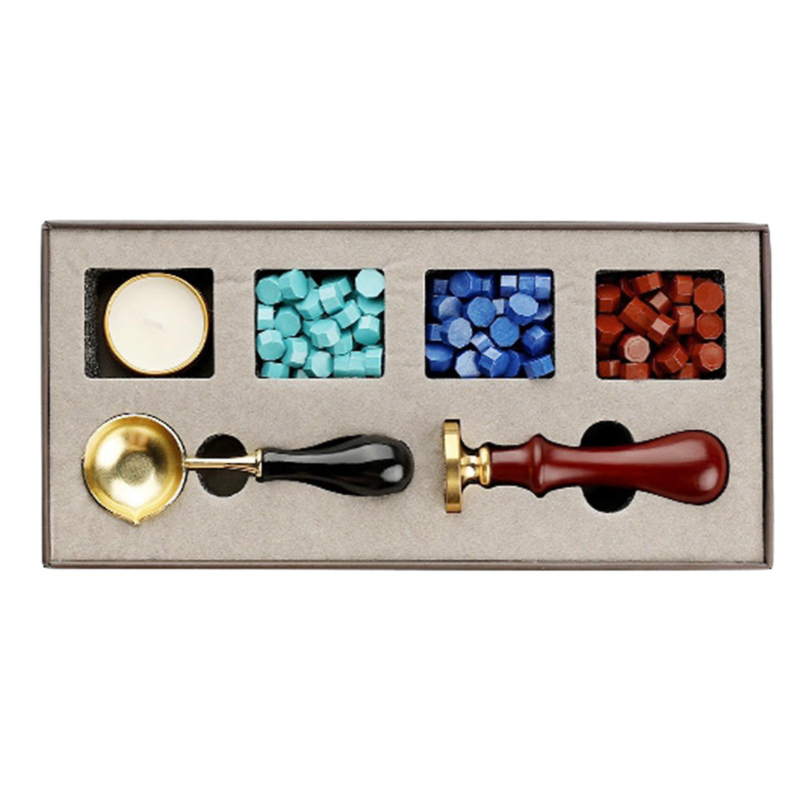 Description: This sealing wax kit comes with a box of 40pieces wax seal beads in 3 different colors, 1 wax stamp, 1 tea candles a melting spoon set to meet your various handicrafts needs. Our wax seal stamps are made from quality brass head with wax melting spoon, which can easily make beautifully detailed wax imprints; Sealing wax beads are made of wax, melt smoothly and quickly. Made of wood and brass. Candles are smokeless and nontoxic, eco-friendly. Spoon is made of stainless steel and wooden, sealing wax beads melt easily and dry quick to save your efforts and can easily make beautiful detailed wax imprints. Easy to use: just take out 5 wax beads, heating the wax beads with melting spoons, then pour the melted wax into the sealing position of the envelope, use the seal printing on it, and take off the stamp lightly, color it on the ink pad. A good helper to seal and decorate invitations, maps, retro letters, manuscripts, envelopes, important documents, private keepsakes parcels, cards, crafts, gifts, stationery, an great way to show your creativity. Specification: Material: Brass and Wax Size:23x11x3.5cm/9.06x4.33x1.38inch Package Includes: 1 Piece Tea Candle 1 Piece Wax Stamp 1 Piece Wax Spoon Total 120 Pieces Wax Beads in 3 Colors Note: Please allow slight dimension difference due to different manual measurement.